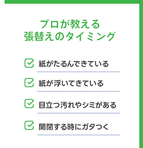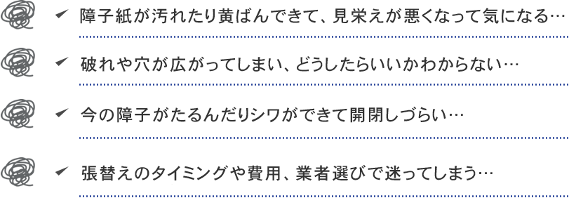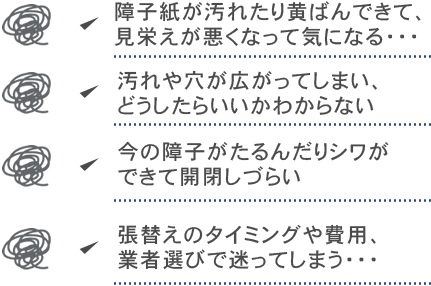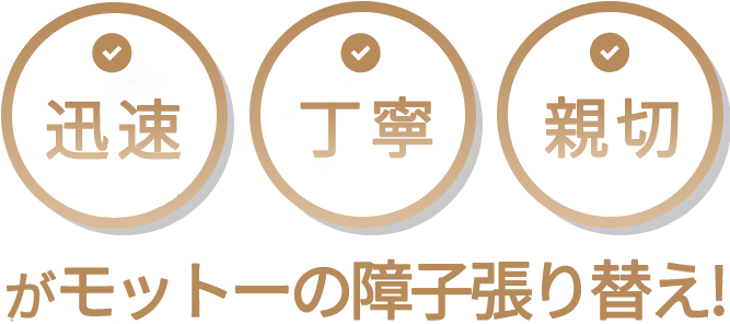 障子の張り替え後、すぐに破いてしまったり汚してしまっても『無償張替え』をしています。張替えから時間が経った後に開け閉めがスムーズでなくなった際も対応をさせていただきます。※詳細は担当スタッフへご相談ください。